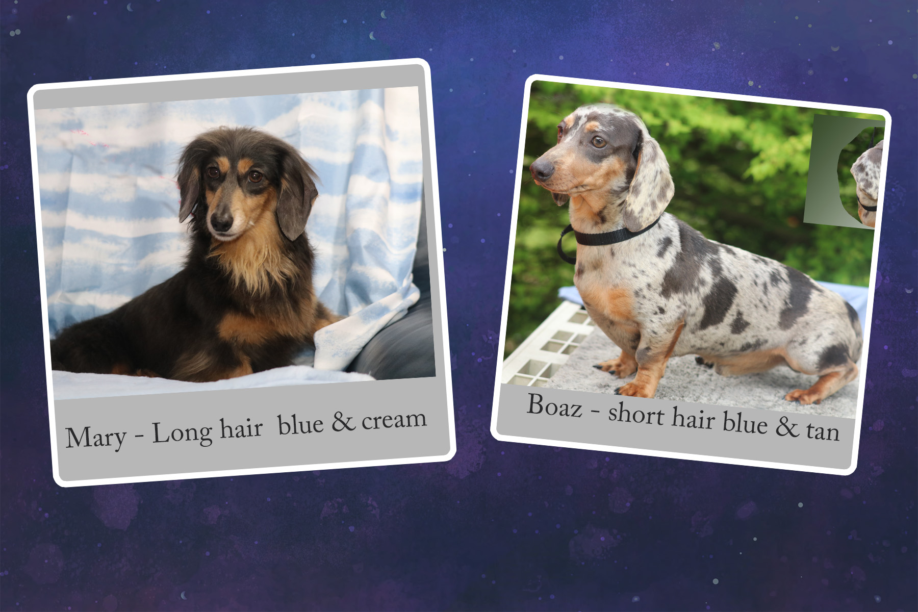 Expecting long & short hairs – dapples, blue & tan/creams, black & tan/creams.