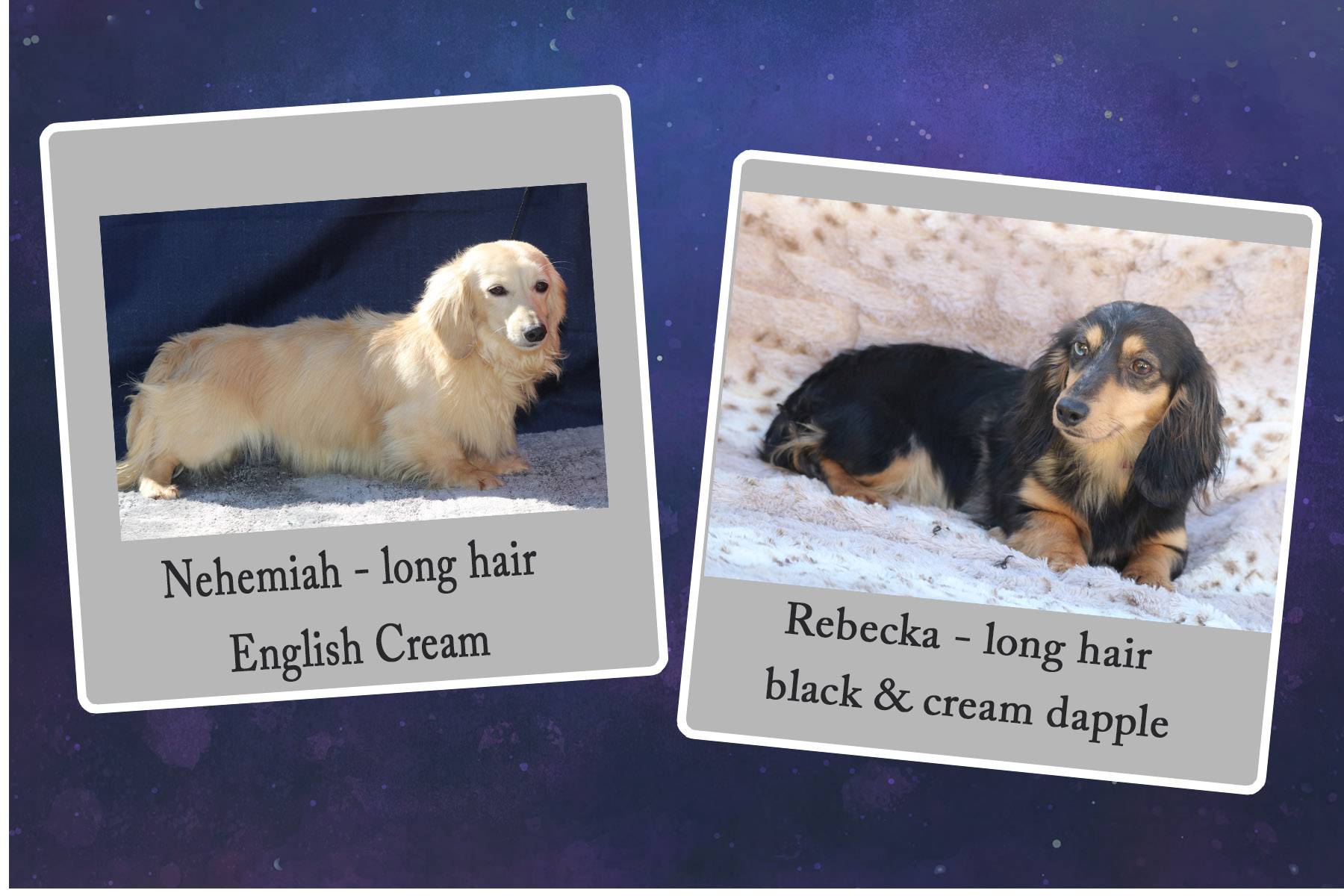 Rebekah is a long hair black & cream dapple weighing 9 lbs. and Nehemiah is a full English Cream weighing 9 lbs.