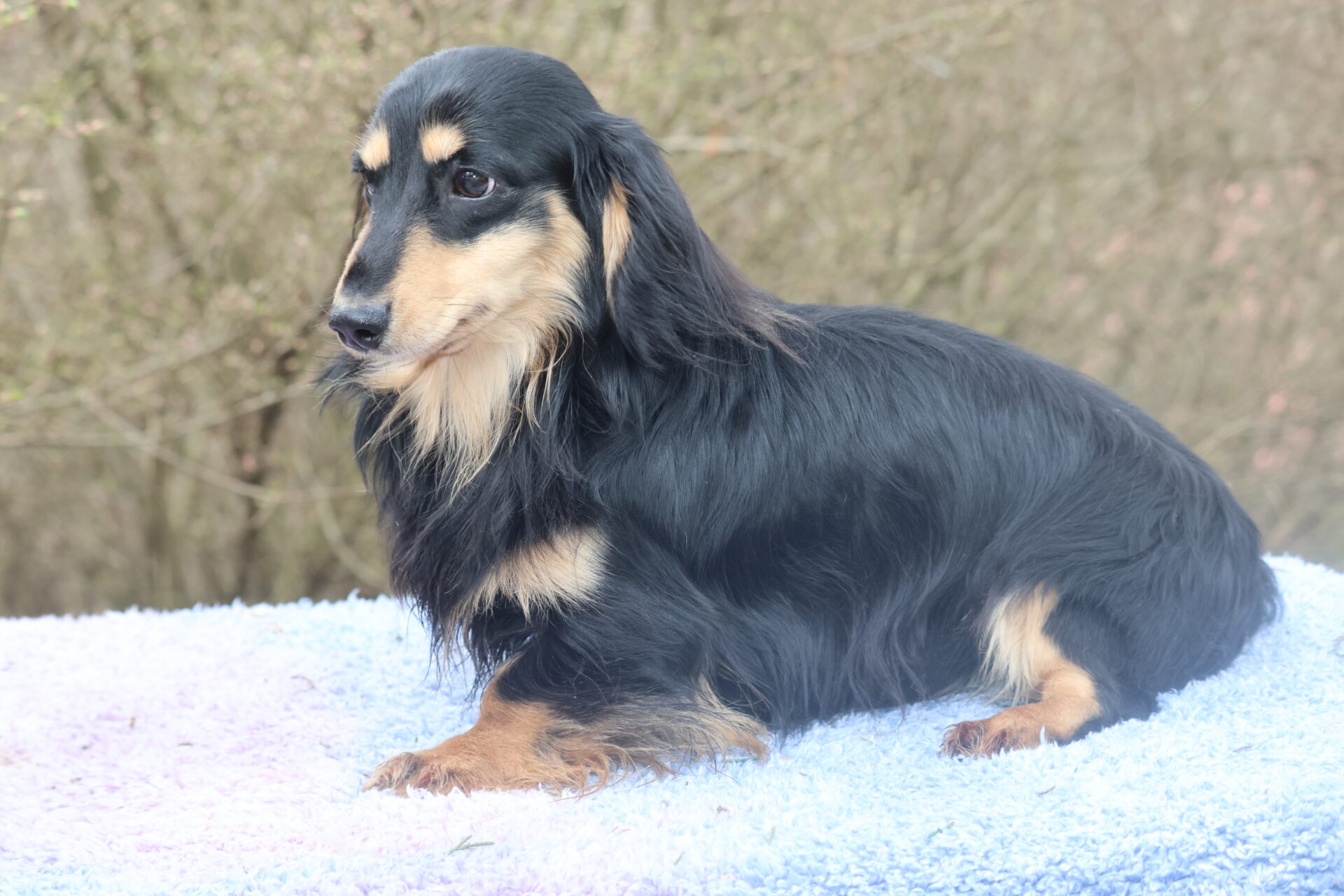 John Jr. is the son of the late Little John, one of our very first lines of Doxies. He didn’t turn out cream like his dad but he is every bit as handsome. He has a great loving personality. We are so glad we kept him.